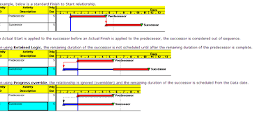 Progress Override:a rede lógica é ignorada e as atividades podem ter progresso sem atrasar, ou antecipadas.Escolhendo Progress Override significa que a duração restante da atividade out-of-sequence (fora de seqüência) pode continuar a contar do Data Date (data de atualização) e não é atrasada por seus predecessores. Esta opção ignora as relações lógicas uma vez que elas estão quebradas e permite uma atividade com o progresso continuar, mesmo que seus predecessores não tenham terminado.
