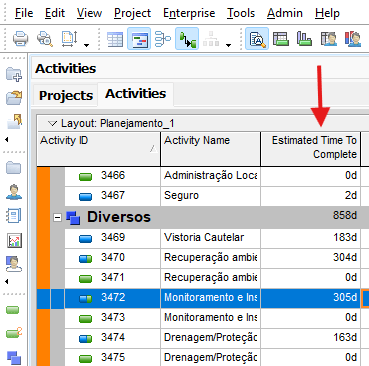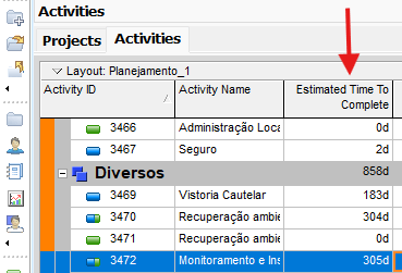 Dois novos campos proporcionam uma visão aprimorada da quantidade de tempo e esforço necessários para concluir o escopo de trabalho restante. O campo "Tempo Estimado para Conclusão" (Estimated Time to Complete) divide a duração original pelo índice de desempenho programado (Scheduled performance index - SPI), fornecendo uma projeção da duração necessária para concluir o trabalho com base na eficiência da mão de obra.