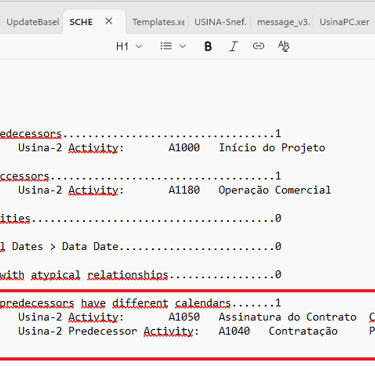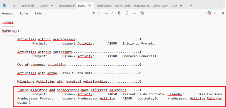 Na seção "Marco de conclusão e predecessores têm calendários diferentes" (Finish milestone and predecessors have different calendars), do registro de agendamento e nivelamento (Log do cálculo), foram adicionadas colunas para ajudar você a identificar as atividades predecessoras afetadas. Além do nome e ID da atividade do marco, do projeto responsável e das datas de início e término, agora você pode ver o nome do calendário que ela utiliza. Você também pode ver os nomes e IDs das atividades predecessoras, os calendários que elas utilizam e os projetos aos quais pertencem para facilitar sua análise.