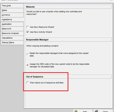 Alerta se a alteração do status de uma atividade puder causar a desordem das atividades. Para ser alertado se uma alteração feita no status de uma atividade puder resultar em um progresso fora de sequência (Out of Sequence - OOS), marque a opção "Avisar sobre atividades fora de sequência" na guia Assistência da caixa de diálogo "Preferências do Usuário".