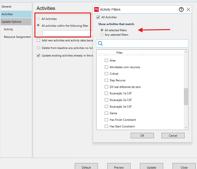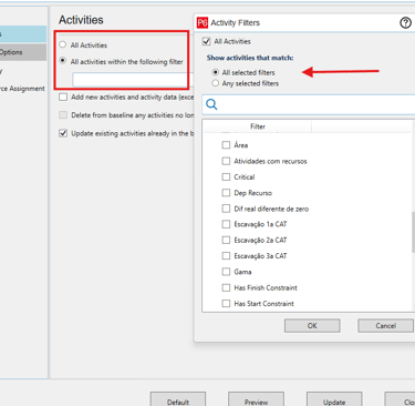Atualizar linha de base de acordo com vários filtros: Ao atualizar uma linha de base, você pode selecionar se deseja atualizar as atividades que correspondem a vários filtros. Você pode escolher se deseja atualizar as atividades que correspondem a todos os filtros ou as atividades que correspondem a qualquer um dos filtros selecionados. Essa questão de fazer para todas atividades ou só nas de alguns filtros já tinha antes, o que melhorou foi a escolha dos filtros default da ferramenta, globais ou filtros seus de usuário:
