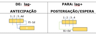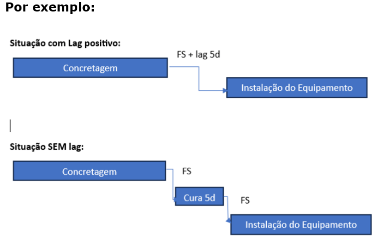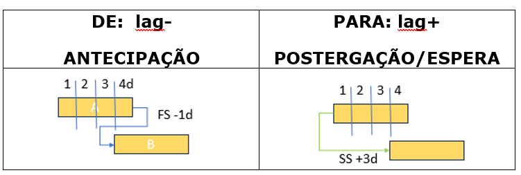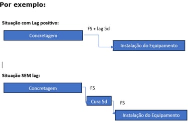 O Lag é utilizado para auxiliar a definir com exatidão o relacionamento lógico entre atividades do cronograma, seja antecipando, seja uma espera, ou postergação, o que será indicado pelo sinal de – ou + nas ferramentas de cronograma como Primavera P6 ou MS Project.