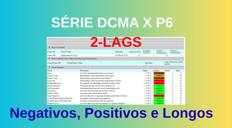 RESUMINDO: Se no contrato do seu projeto pede que use DCMA, esqueça o uso de Lag Negativo, pois a tolerância para este item é zero, ou seu cronograma vai ficar com este item vermelho no Check Schedule do Primavera P6 e vai cair na auditoria do contrato.