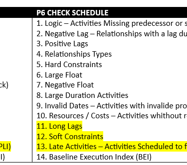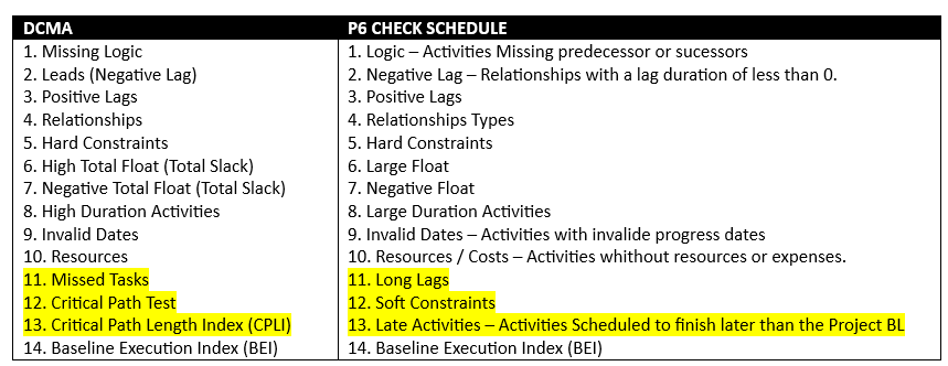 Já mostramos em outro post (https://www.sosimplificar.com.br/14-pontos-de-verificacao-no-cronograma) que os 14 itens do DCMA e do P6 são diferentes em 3 deles, pois existem alguns itens que o DCMA analisa e o P6 já faz isso desde sempre, como a análise do caminho crítico e atividades ausentes (em relação a linha de base), então o P6 inseriu novos itens em substituição, conforme mostramos abaixo:
