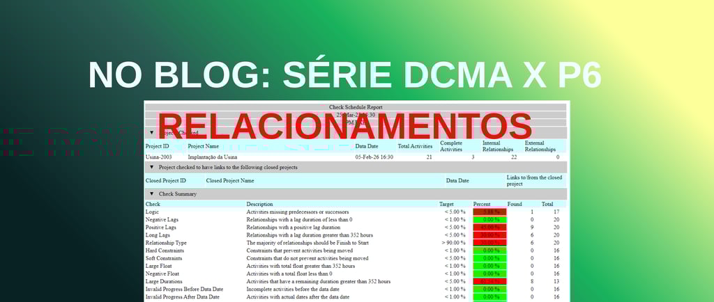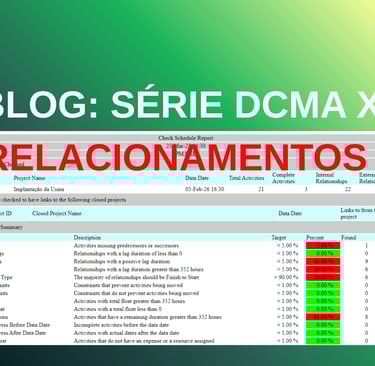 Estamos iniciando uma Série de postagens sobre DCMA X P6, que são os 14 itens de verificação do DCMA, que estão no Primavera P6, para tem mais consistência e solidez em seus cronogramas. Neste primeiro da Série vamos falar sobre RELACIONAMENTOS e sua verificação.